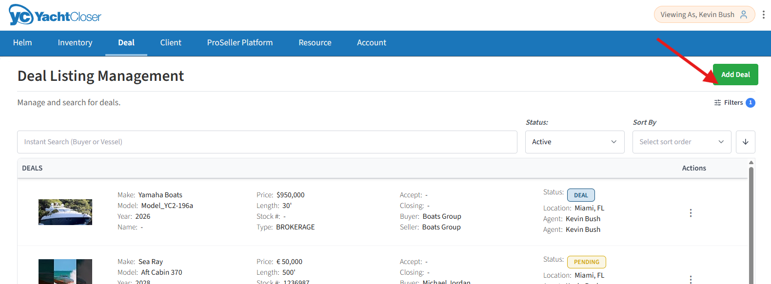 To create a Purchase and Sale Agreement, go to the Deal tab and click the Add Deal button, as displayed below.