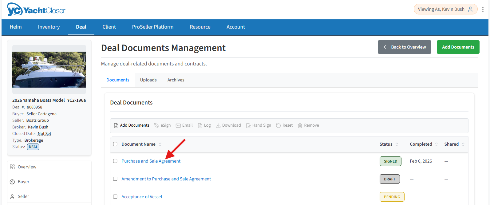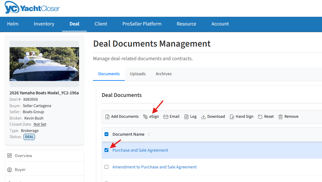 To send the document for eSignature, select Purchase and Sale Agreement and then select the Esign button. For more information see help article How to Send a Listing Agreement for Electronic Signature