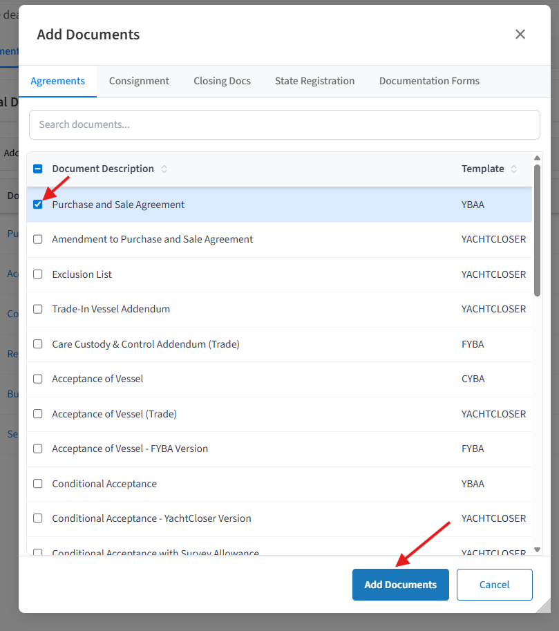 Check the box for Purchase and Sale Agreement and click the Add button.