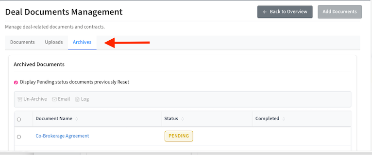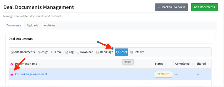 If you need to make changes to a document in Pending or Signed status, you must use the Reset feature on the Documents page. To do so, navigate to the Documents page on either the Inventory or Deal tab. Check the box next to the document you wish to reset and select the Reset button under Options.